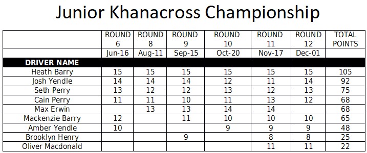 Up and coming driver Tristyn Henry won the Junior Motorkhana Championship, amassing 78 points for the season ahead of Daniel Andrews 59 points and Baylee Morana 54 points.